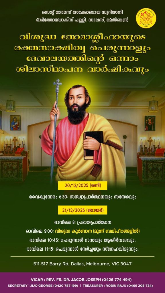 I pray that you are all keeping well in this beautiful city of Melbourne. If you are seeking Orthodox worship—especially in the Syrian Orthodox tradition—we warmly invite you to join us at 511–517 Barry Road, Dallas, 3047, for worship and community activities.
